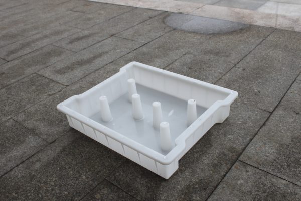 此款邊溝蓋板塑料模具采用塑料聚丙烯注塑加工而成,二端以缺口設計,方便后期對于邊溝部分區域是否堵塞情況。而在蓋板塑料模具的內部共設置了六個塑料堵頭,實際上就是水泥蓋板成品上的六個下水孔。