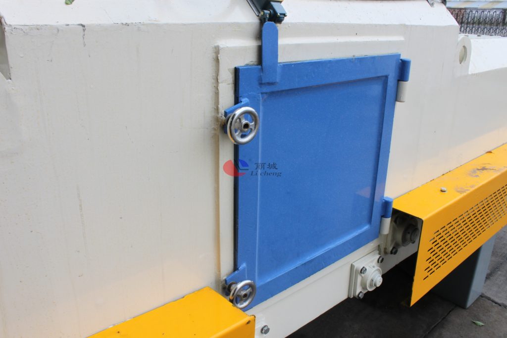 4.在將水泥地磚輸送至混凝土路面拋丸機內部中后,通過使用步道磚模具澆筑成型的混凝土步道磚,受到來自空間結構的不同方向的拋頭的密集強力彈丸的打擊與摩擦,使其其表面毛化,美飾。地面磚表面獲得一定的粗糙度的光潔表面,路面拋丸機在工作時,工作人員需要遠離室體進出口處,防止彈丸飛濺入眼,并需要進行掛牌警示。