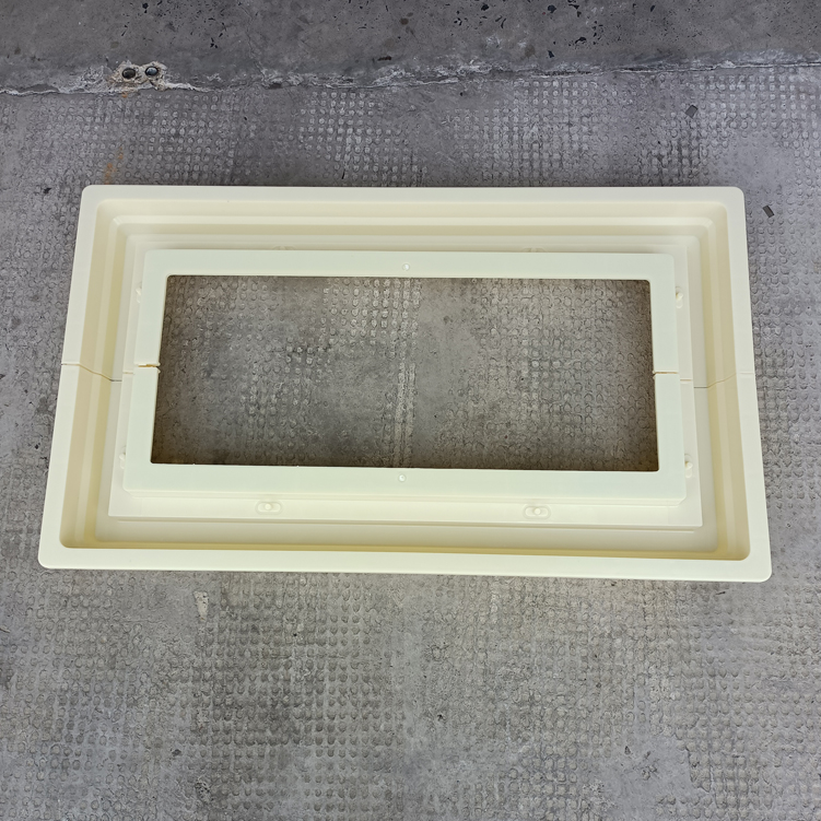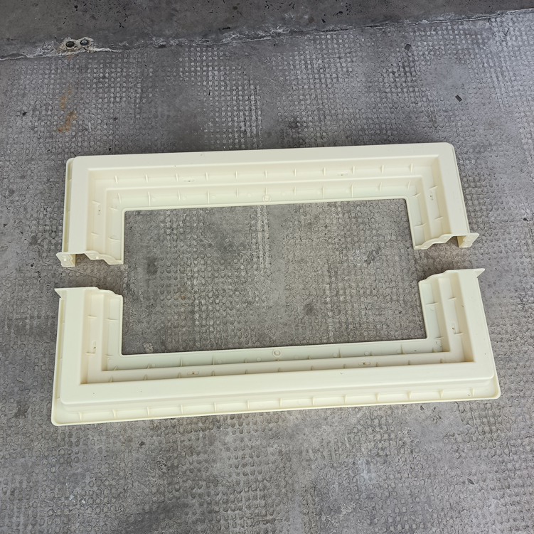方井座塑料模具,模具采用拼接方式、為兩個(gè)組裝而成、寬度可以增加調(diào)節(jié),有設(shè)配件井座B,該長(zhǎng)度、寬度尺寸為模具尺寸最外邊、包括翻邊。
